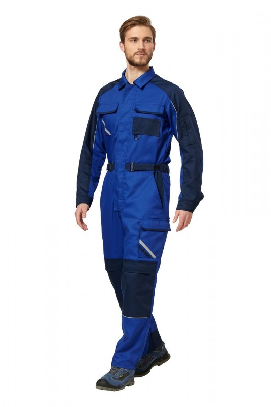 Ткань смесовая Твил (65 % полиэфир, 35 % хлопок), плотность 210 г/м2. Цвет: синий с тёмно-синей отделкой. Светоотражающий кант (СОП) по кокетке, рукавам и усилительным накладкам в области колен. Комбинезон с центральной застежкой на двухзамковую молнию и ветрозащитную планку. На груди карманы с клапанами и креплением для бейджа. В области подмышечных впадин вентиляционные отверстия с двойной сеткой. На левом рукаве карман для средств связи. Рукава на манжетах. Спинка стянута по линии талии эластичной тесьмой, дополнительный объем на спинке обеспечивает свободу движения. На задней части брюк комбинезона накладной карман с клапаном, на уровне бедра удлиненный карман с держателем для инструментов.