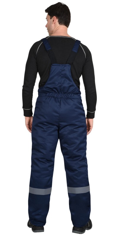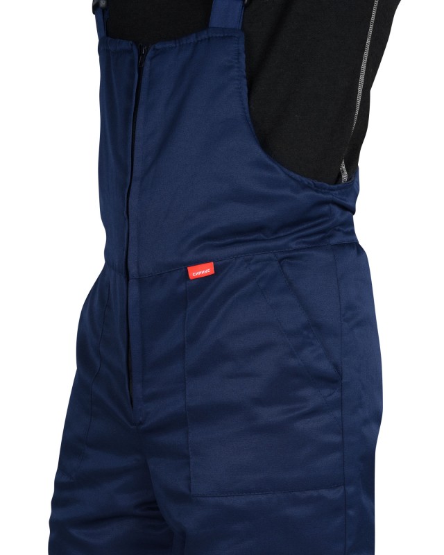 Полукомбинезон прямой, на утепленной подкладке, с центральной застёжкой на двухзамковую молнию R-вида, с накладными боковыми карманами, с резинкой по спинке, с регулируемыми бретелями. По низу полукомбинезона световозвращающая лента 50 мм для обеспечения сигнальной видимости.