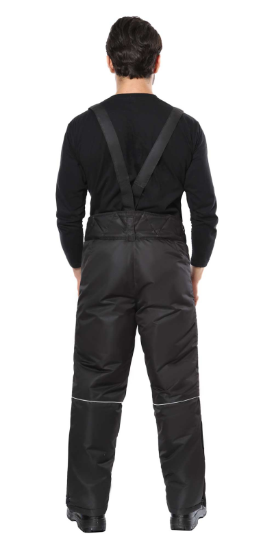 Брюки прямые на утеплённой подкладке, с застежкой спереди на молнию – гульфик. Брюки с широким поясом с застежкой на 2 пуговицы, с боковыми накладными карманами с молнией, со съёмными бретелями. Бретели пристегиваются к брюкам при помощи пуговиц и петель, регулируются по длине защелками-фастексами. По боковым швам внизу разрез с молнией. В брюках на задних половинках предусмотрен кант СВМ 3мм 100К для обозначения сигнальной видимости.