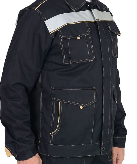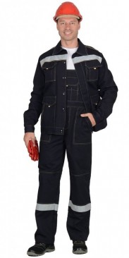 Куртка укороченная, с отложным воротником,с центральной потайной застежкой на пуговицы, пояс регулируется по ширине патами и пуговицами. Полукомбинезон прямого покроя, с центральной заст.жкой спереди, с усилительными накладками в области колен. Костюм с контрастными строчками и СОП шириной 50 мм. ГОСТ 12.4.280-2014.