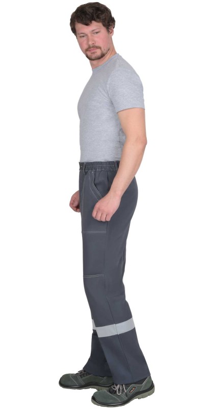Брюки прямые, выполены из ткани "Контакт 250А", с застёжкой гульфика на пуговицы, с притачным поясом, с частичной стяжкой по бокам на резинку, с внутренними боковыми карманами и наколенниками, с двумя задними накладными карманами и карманами для инструментов. В брюках предусмотрен СОП шириной 50 мм для обозначения сигнальной видимости.