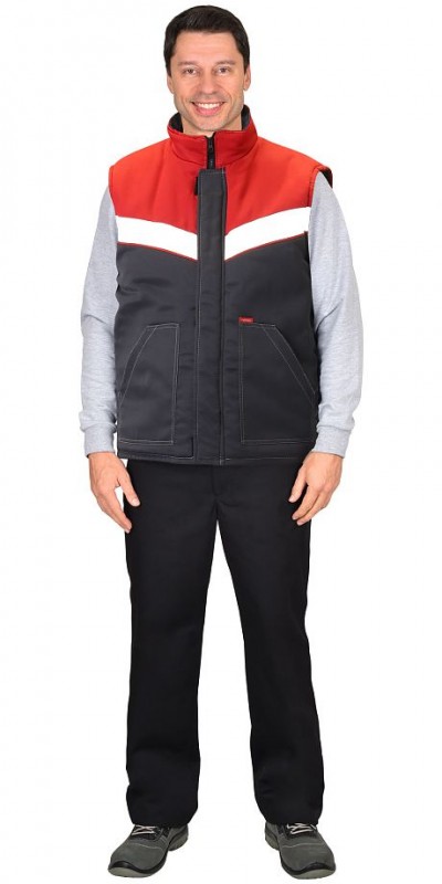 Жилет утепленный, с центральной бортовой застёжкой на тесьму - «молнию», с ветрозащитной планкой застегивающийся на потайные липучки 3шт., с накладными карманами с косым входом, с внутренним карманом застегивающийся на тесьму - «молния», с фигурной линией низа. В жилете предусмотрен лента светоотражающая (серая) 50мм 100% п/э для обеспечения сигнальной видимости в условиях пониженной видимости.