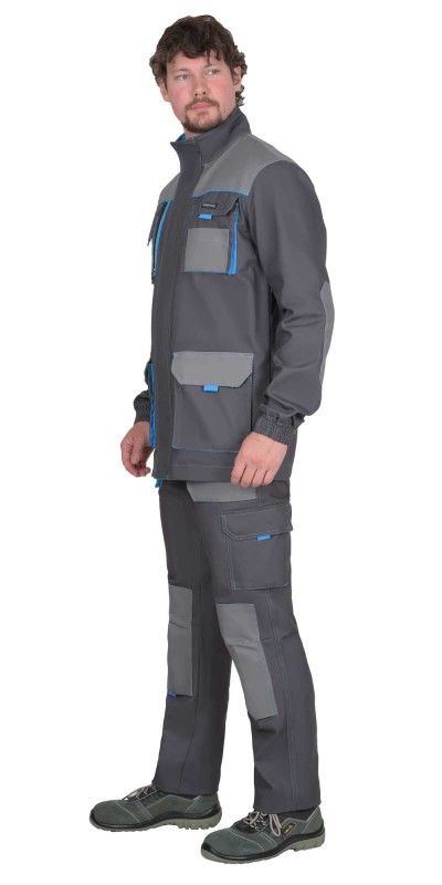 Костюм имеет множество многофункциональных накладных комбинированных объемных карманов с контрастной отделкой. На манжетах рукавов и в области талии на полукомбинезоне по всей ширине вставлена резинка для лучшего прилегания к телу. Куртка снабжена качественной центральной бортовой застёжкой на молнию. Объемные наколенники защищают колени от сквозного истирания. Костюм хорошо зарекомендовал себя в работе и является популярной моделью.