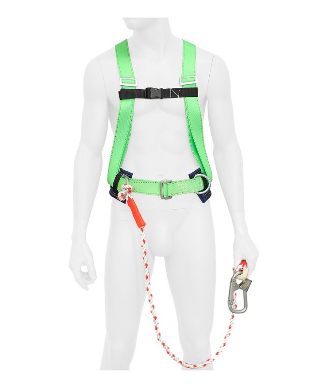 Система состоит из привязи с наплечными лямками (ремня с пряжкой, кушака, двух D-колец на поясе и одного на спине) и стропа (полиамидный канат, монтажный карабин и крепежная петля).