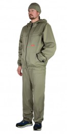 Костюм состоит из куртки и брюк. Куртка укороченная, с центральной застёжкой на молнию, капюшон с утяжкой по лицевому вырезу, верхние накладные карманами с клапанами, застегиваются на потайную липучку, нижние накладные карманы на молнию. Низ куртки и рукавов стянут резинкой.