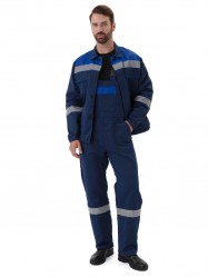 - Костюм мужской, летний, прямого силуэта, состоит из куртки и полукомбинезона. Куртка: - центральная супатная застежка на пуговицы - отложной воротник - кокетки полочек и спинки выделены световозвращающей лентой СОП - нагрудные накладные карманы с отделением под ручку - нижние объемные накладные карманы - рукав на притачной манжете с застежкой на пуговицу, выделены световозвращающей лентой СОП, в области локтя-усилительные накладки - притачной, регулируемый по ширине за счет эластичной тесьмы “резинка” по боковым сторонам, пояс Полукомбинезон: - отрезная грудка на притачном поясе; - регулируемые по длине бретели; - нагрудный карман с защитным клапаном на контактной ленте “липучка” - объемные боковые накладные карманы; - центральная застежка гульфик на молнии - дополнительная застежка на пуговицу в правом боковом шве - линия талии спинки регулируется по ширине за счет эластичной тесьмы “резинка” - нижняя часть выделена световозвращающей лентой СОП