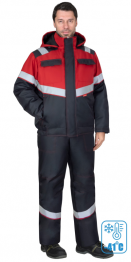 Костюм зимний, утеплённый, состоит из укороченной куртки и полукомбинезона. В костюме предусмотрена лента светоотражающая мелкодисперсная белая ш.50 мм для обеспечения видимости.