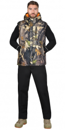 Жилет утеплённый, стёганный, на подкладке, с втачным капюшоном, с центральной застёжкой на молнию, закрытую ветрозащитным клапаном от края капюшона до низа изделия, застёгивающимся на кнопки. Жилет с одним нагрудным карманом с молнией и двумя нижними карманами. Спинка жилета, удлинённая с фигурной линией низа. Пройма окантована резинкой. Объём капюшона по лицевому вырезу регулируется шнуром с фиксаторами.