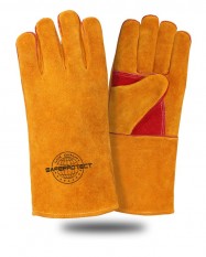 Краги СИБИРЬ спилковые усиленные, прошитые огнеупорной нитью Kevlar, для защиты от механических воздействий (истирание, прокол, порез, разрыв) и повышенных температур (от теплового излучения, конвективной теплоты, от искр и брызг расплавленного металла, от кратковременного воздействия открытого пламени, контакта с нагретыми поверхностями до +250*С) из цельного спилка, пятипалые, с дополнительным термоизолирующим слоем из флиса, на подкладке из хлопчатобумажной ткани в области манжеты. Спилок КРС, сорт АВ (1,4+/– 0,2 мм), шлифованный, желтого (золотого) цвета, двойные швы, усилены вставками из кожи, на ладонной части и большом пальце дополнительный слой из спилка красного цвета.