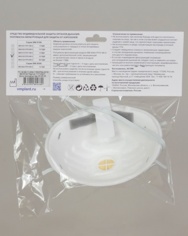 Респиратор ВМ-8122 NR D FFP2 (12 ПДК) с клапаном, чашеобразная, от аэрозолей (инд.упак.1х100) (Арт. 159810) РЕС 22/1