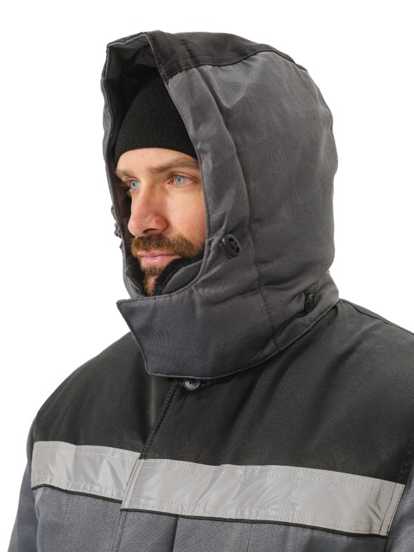 - Съемный утепленный капюшон, фиксируется на воротнике с помощью пуговиц, на подбородочной части застегивается на липучку, по лицевому срезу проходит кулиса, утяжкой служит шнур-резинка с фиксаторами, на затылочной части капюшон регулируется по высоте с помощью паты на липучке