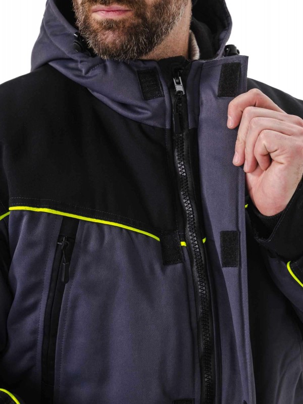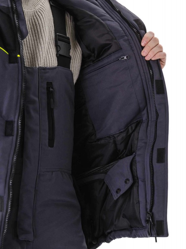 - прямого силуэта, удлиненная с центральной застежкой на двух-замковую молнию трактор Т-8 с утепленным ветрозащитным клапаном на потайных липучках, верхнюю часть молнии защищает ветровик, лицевая часть которого выполнена из мягкого флиса для более комфортного прилегания к подбородочной части лица;