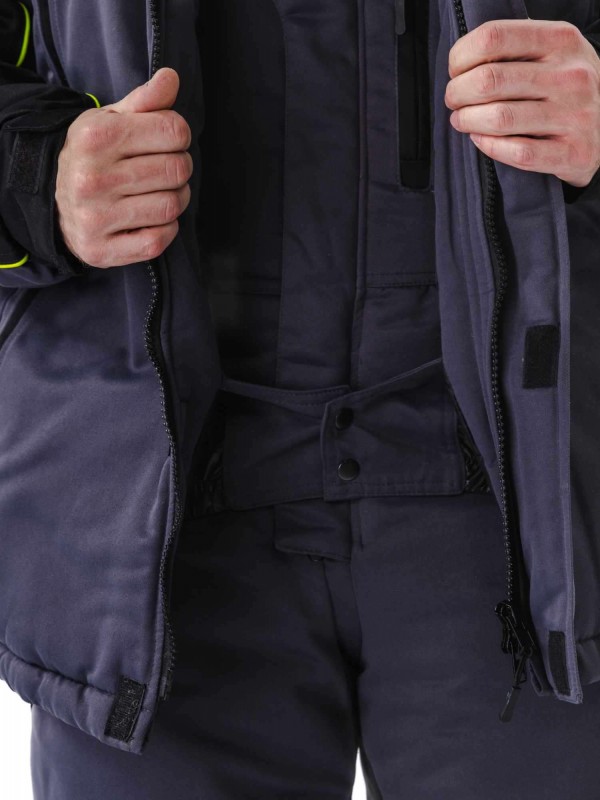Утепленный мужской костюм состоит из куртки с капюшоном и полукомбинезона.