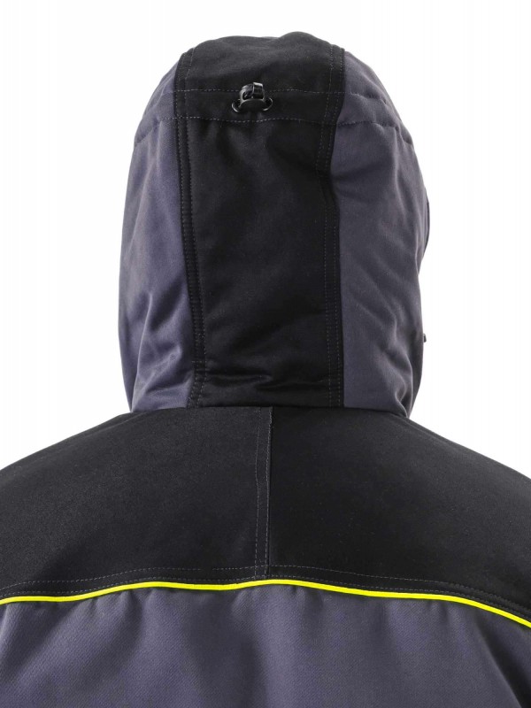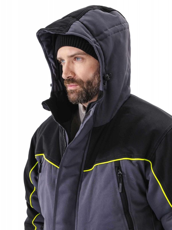 - капюшон втачной, утепленный мягким флисом, с цельнокроеным козырьком, лицевая и затылочная часть с кулисками для регулировки по объему и высоте, утяжкой служит шнур-резинка и фиксаторы;