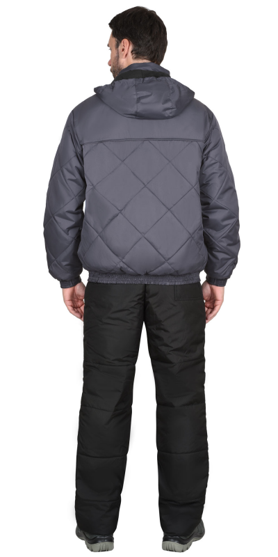 Куртка утеплённая, укороченная, по низу с поясом частично сосборенным на резинку, воротником стойка, центральной застёжкой молния от края воротника до низа куртки, верхним нагрудным прорезным карманом с молнией и нижними накладными карманами, съёмным капюшоном, втачными рукавами с манжетами, частично сосборенными на резинку. Куртка и капюшон на подкладке из флиса, на подкладке куртки с правой стороны накладной карман. Полочки, спинка, рукава и нижние карманы куртки выстеганы в виде ромбов.