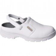Туфли из микрофибры с открытой пяткой (сабо). Фиксация на ноге с помощью ремешка, длина которого регулируется контактной лентой. Металлический защитный подносок. Литьевой метод крепления подошвы. Подошва двухслойная, устойчивая к скольжению (тест SRC). Съемная формованная стелька.
