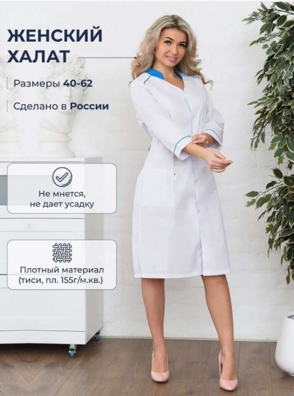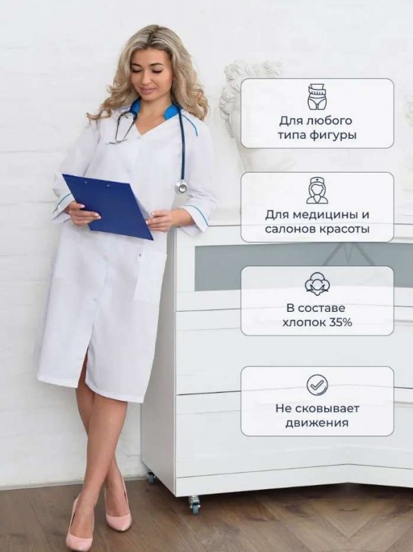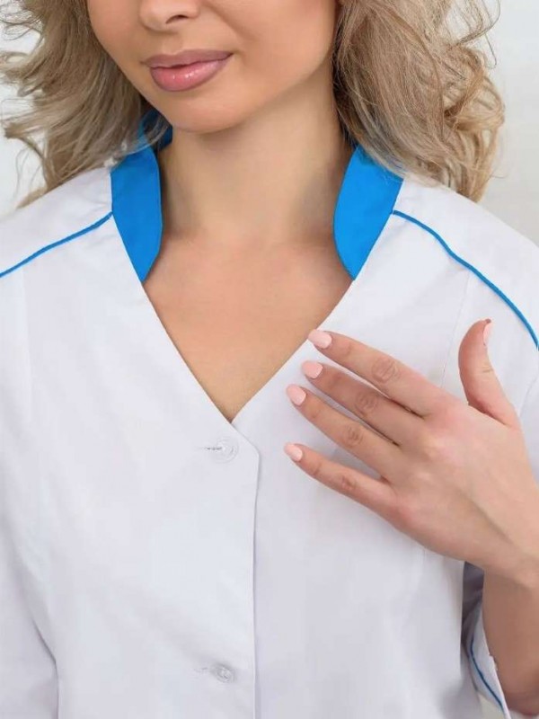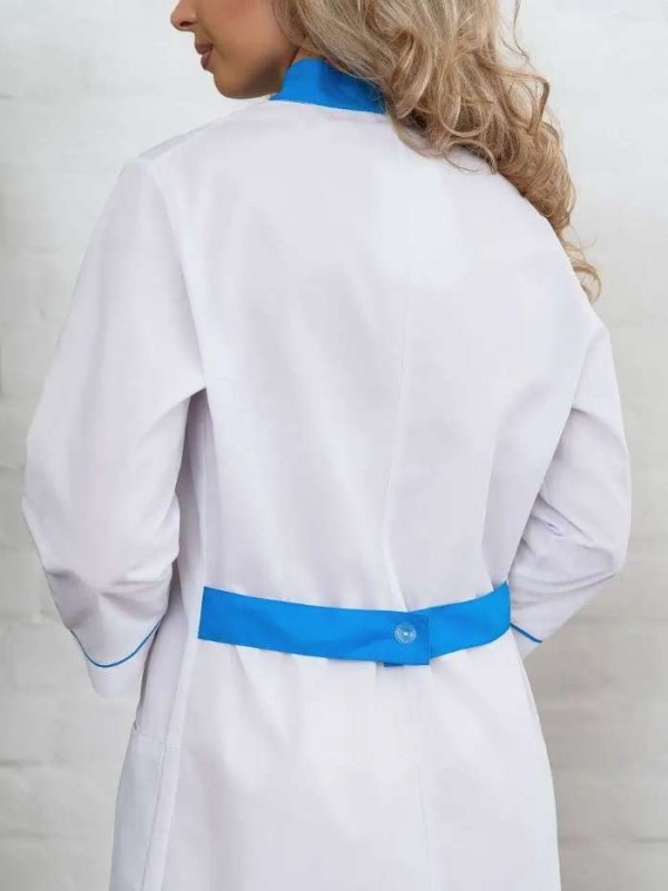 Элегантная спецодежда для женщин прилегающего силуэта. Гармоничная, бело-голубая цветовая гамма в сочетании с выдержанным стилем создаст достойный, презентабельный образ медработника. Женский медицинский халат максимально комфортен и легок в носке. В основе ткань "Тиси" (хлопок 35%, полиэфир 65%), плотностью 120 гр/м2. Ткань водоотталкивающая и воздухопроницаемая, устойчива к износу. Медодежда высокого качества, прослужит надолго. Халат медицинский с 3/4 рукавом с манжетами и отделочным кантом. Воротник стойка из отделочной ткани. Застегивается на пуговицы. Имеет боковые, накладные карманы, которые функциональны в работе. Объем по талии можно регулировать хлястиками. По низу в боковых швах разрезы. Длина - чуть ниже колен. Униформу можно носить как самостоятельно, так и в сочетании с брюками. Белый халат прекрасно сидит, не сковывает движения, не причиняет дискомфорта. Представлена широкая размерная сетка: 40-62, в том числе большие размеры. Подойдет для медработниц разных возрастов и с разным типом фигуры. Проявите повышенное внимание и любовь к медицинскому работнику и работнику смежных отраслей, подарив высококачественную и комфортную медицинскую одежду интересного и уникального дизайна. Качественная и удобная медицинская одежда порадует каждого работника медицинской сферы.