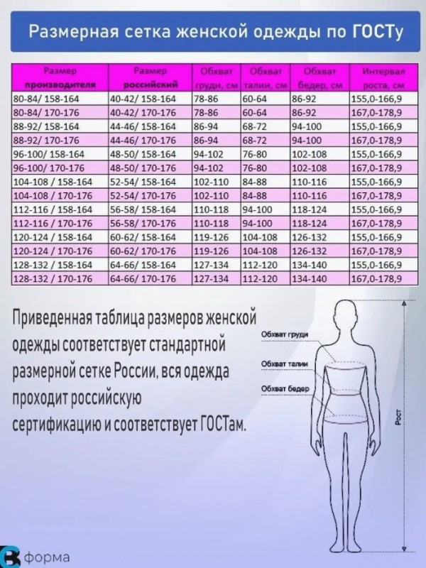 - Размерный ряд: с 40-42/158-164 по 60-62/170-176.