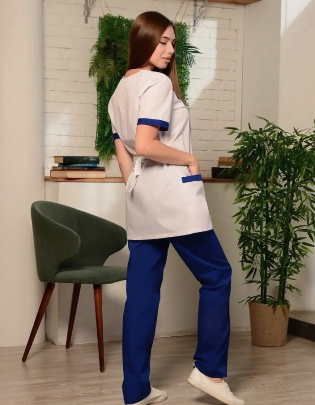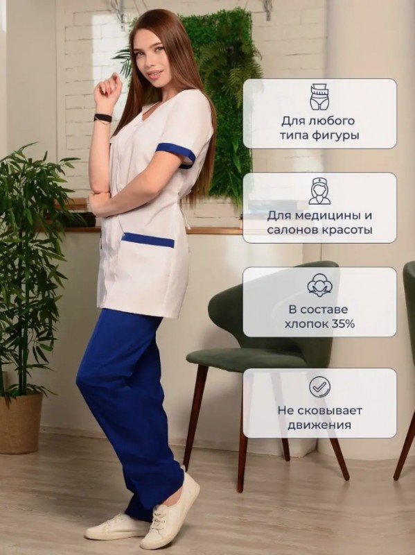 Элегантный медицинский костюм женский для ценительниц тонкого вкуса и комфорта в рабочей униформе. Спецодежда изготовлена из качественного материала, который прекрасно дышит и приятен к женскому телу. В данном рабочем комплекте женской одежды вы ощутите себя свободно, легко и максимально удобно. Прекрасная спецодежда медикам включает блузу и брюки. Блуза очень нежная и женственная, изготовлена в белом цвете, имеет васильковые вставки по рукавам и в верхней части карманов. Модель с коротким рукавом и V-образным вырезом горловины. Застегивается на удобную молнию. Имеется регулировка на спине в виде завязки. По бокам - функциональные накладные карманы. Стильные штаны медицинские прямые и длинные. В поясе на удобной резинке. Брюки однотонные, представлены в васильковом цвете. Широкая размерная сетка, в том числе большие размеры. Для медработниц с разным типом фигуры. Этот стильный костюм с коротким рукавом подойдет не только врачам, но и массажистам, косметологам, мастерам маникюра, мед. сестрам. За счет гармоничного сочетания отличного качества и прекрасного дизайна униформа создаст неповторимый образ. Проявите повышенное внимание и любовь к медицинскому работнику и работнику смежных отраслей, подарив высококачественную и комфортную медицинскую одежду интересного и уникального дизайна.