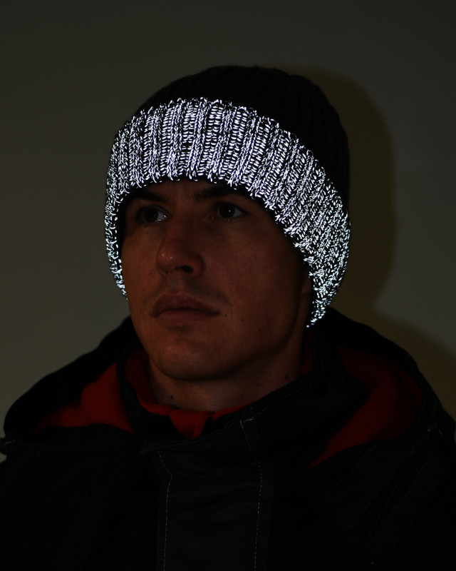 Шапка трикотажная с СВ элементами из акриловой светоотражающей пряжи (100% акрил) с утеплителем Тинсулейт С40 на флисовой подкладке.