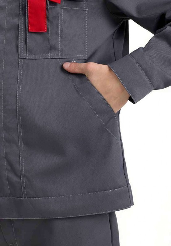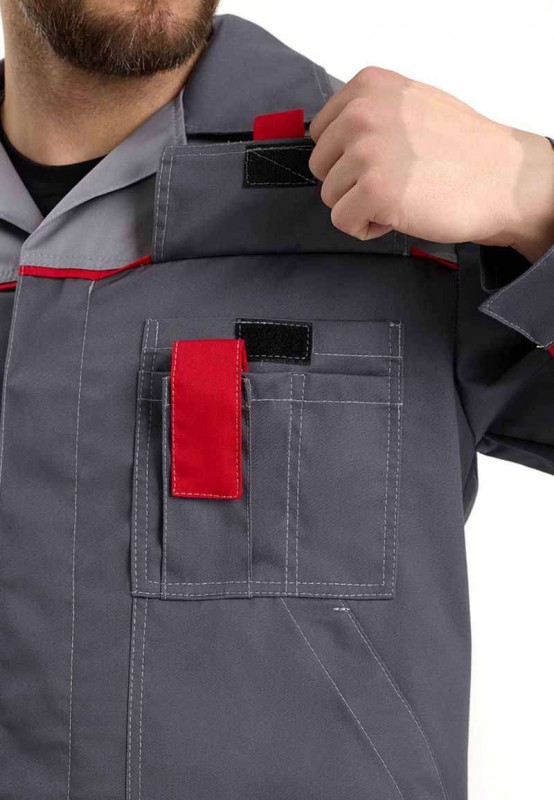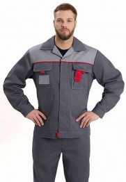 Современный удобный мужской костюм из высококачественной смесовой ткани убережет работника от общепроизводственных загрязнений и послужит отличным помощником в решении задач любой сложности. Костюм состоит из укороченной куртки и брюк серого цвета со светло-серыми и красными вставками.