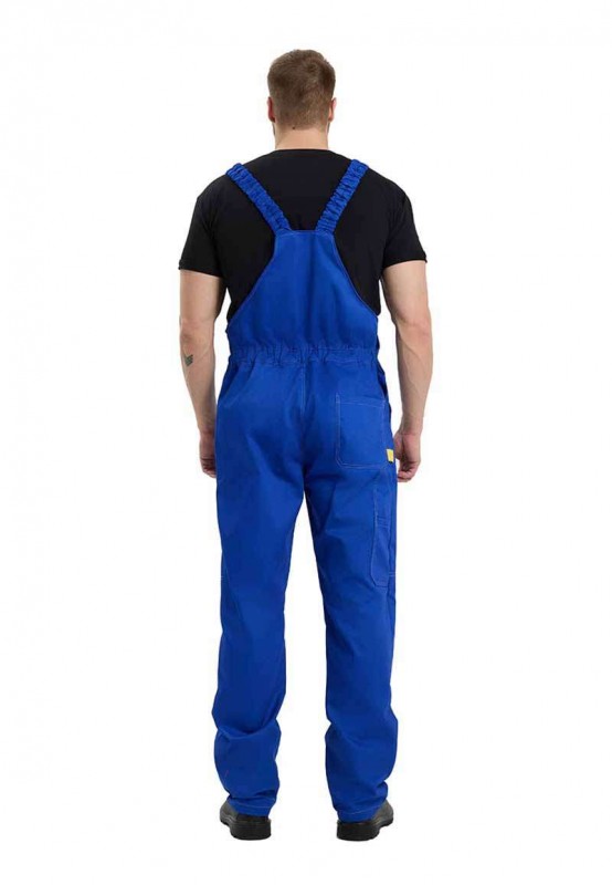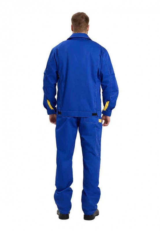 Современный удобный мужской костюм из высококачественной смесовой ткани убережет работника от общепроизводственных загрязнений и послужит отличным помощником в решении задач любой сложности. Костюм состоит из укороченной куртки и полукомбинезона василькового цвета со светло-серыми и желтыми вставками.