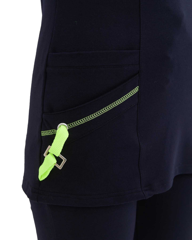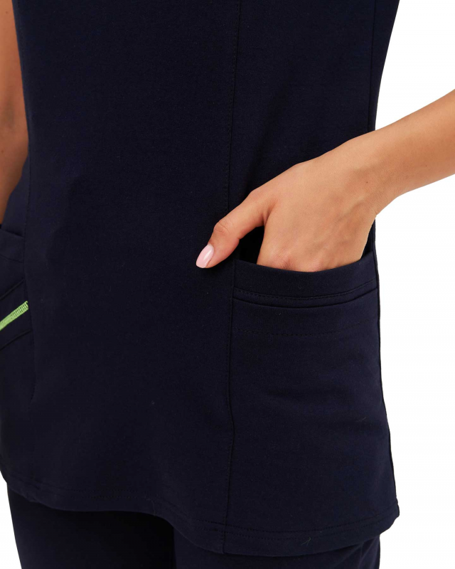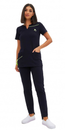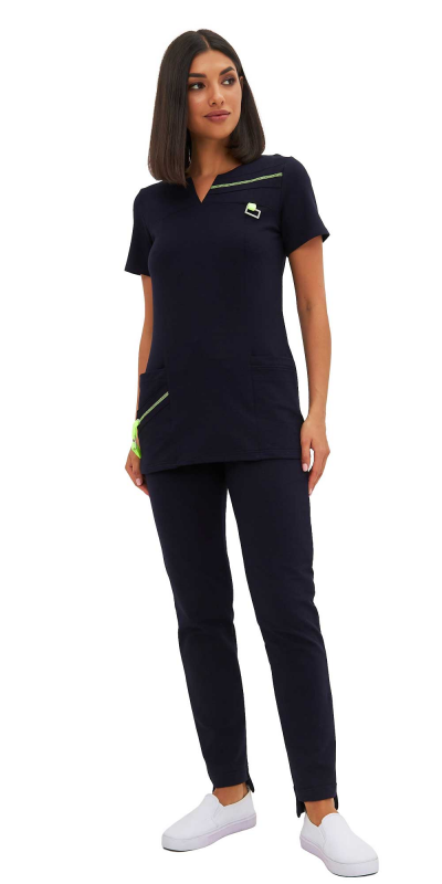 Костюм состоит из блузы и брюк, предназначен для медицинских работников, а также для спорта и отдыха. В костюме предусмотрены декоративные элементы.