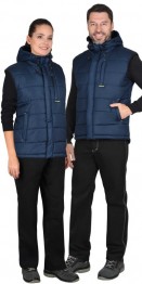 Жилет утеплённый, выстеган с утеплителем горизонтальными строчками, на подкладке, с втачным капюшоном, с застёжкой на молнию, закрытую ветрозащитным клапаном от края капюшона до низа изделия, застёгивающимся на кнопки. Жилет с одним нагрудным карманом с молнией и двумя нижними карманами. Спинка жилета, удлинённая с фигурной линией низа. Пройма окантована резинкой. Объём капюшона по лицевому вырезу регулируется шнуром с фиксаторами.