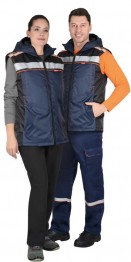 Жилет утепленный, с центральной бортовой застёжкой на тесьму-«молния», с подрезными бочками, с верхними карманами на «молнии» в рельефе, с нижними карманами в рельефе, с втачным капюшоном. В жилете предусмотрена лента светоотражающая (мелкодисперсная белая) 25мм и 50мм