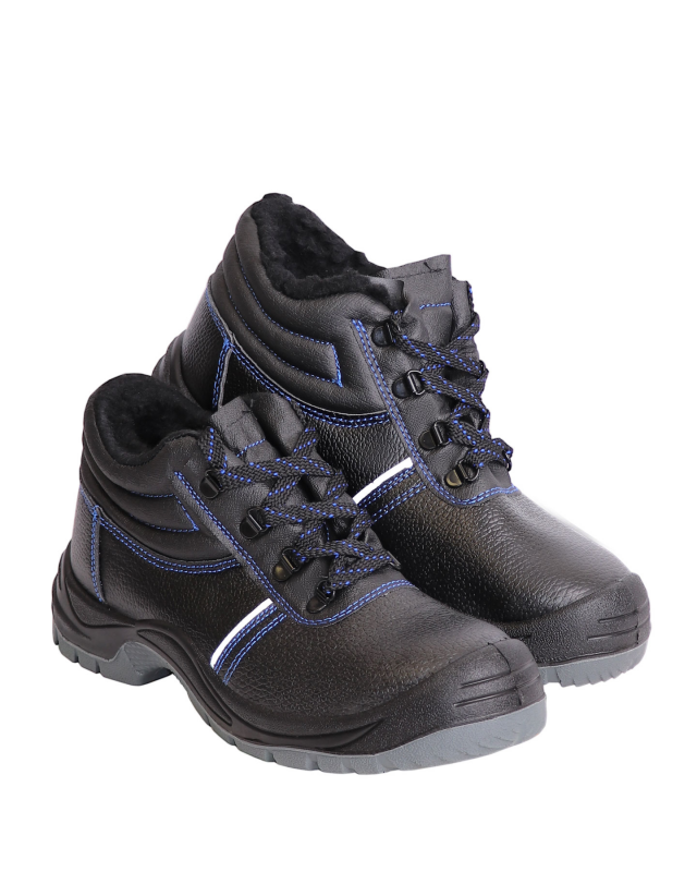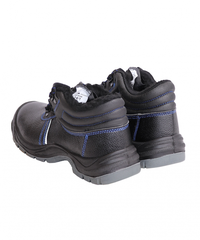Ботинки из кожи c мягким кантом и глухим клапаном для защиты ног от общих производственных загрязнений в зимний период. Подкладка и вкладная стелька изготовлены из искусственного меха. Шнуровка обеспечивает комфортную адаптивную посадку. Светоотражающие элементы повышают видимость работников в темное время суток и на неосвещенной территории. Двухслойная маслобензостойкая полиуретановая подошва литьевого метода крепления имеет вставку в пяточной части подошвы, обладающую амортизационными свойствами и способную гасить ударные нагрузки при ходьбе. Глубина протектора ходового слоя обеспечивает хорошую сцепляемость с поверхностями и препятствует скольжению за счет рельефа протектора. Металлический подносок обеспечивает защиту пальцев стопы от механических повреждений ударной прочностью до 200Дж.