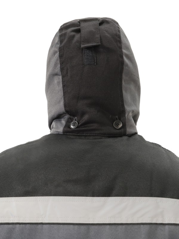 - Съемный утепленный капюшон, фиксируется на воротнике с помощью пуговиц, на подбородочной части застегивается на липучку, по лицевому срезу проходит кулиса, утяжкой служит шнур-резинка с фиксаторами, на затылочной части капюшон регулируется по высоте с помощью паты на липучке