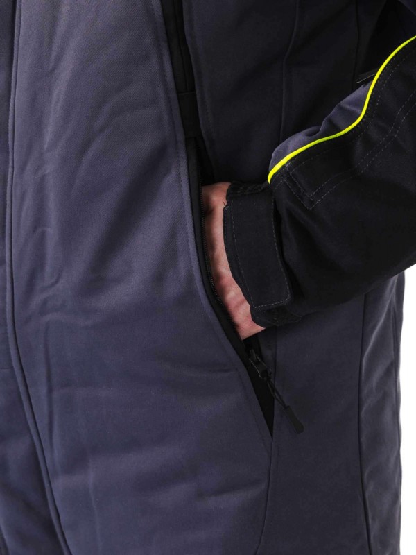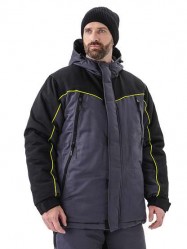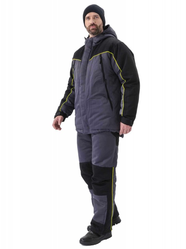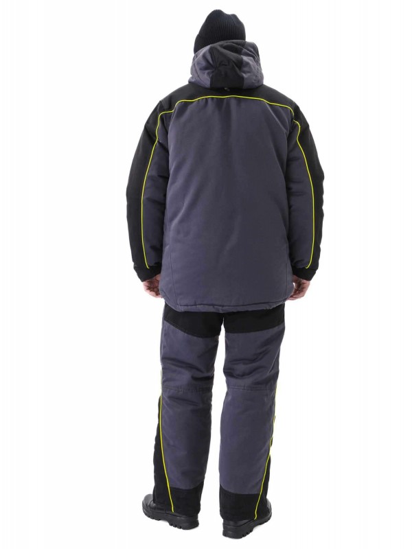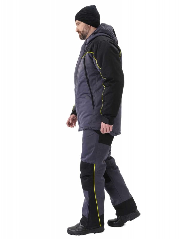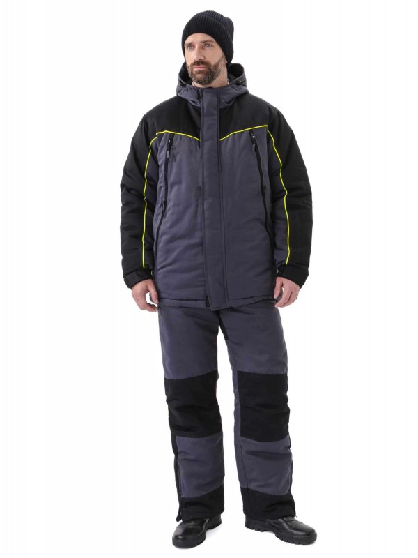 Утепленный мужской костюм состоит из куртки с капюшоном и полукомбинезона.