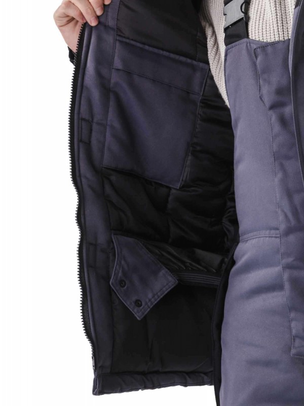 - прямого силуэта, удлиненная с центральной застежкой на двух-замковую молнию трактор Т-8 с утепленным ветрозащитным клапаном на потайных липучках, верхнюю часть молнии защищает ветровик, лицевая часть которого выполнена из мягкого флиса для более комфортного прилегания к подбородочной части лица;