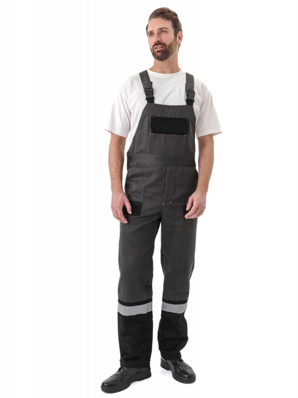 Полукомбинезон с боковыми накладными карманами с усилениями. По талии и в бретелях эластичная лента. Интересное цветовое решение и наличие световозвращающей полосы выделяет костюм из множества.
