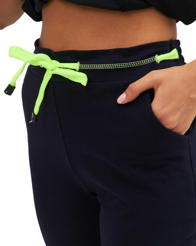 Брюки зауженные, с боковыми внутренними карманами, отрезным поясом, частично стянутым резинкой и контрастным шнуром, для лучшей посадки на фигуре. Низ брюк разной длины, сзади длиннее, спереди короче.