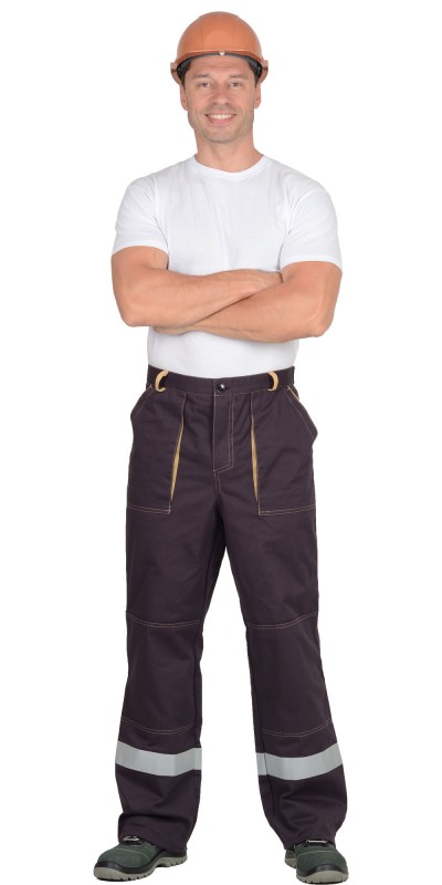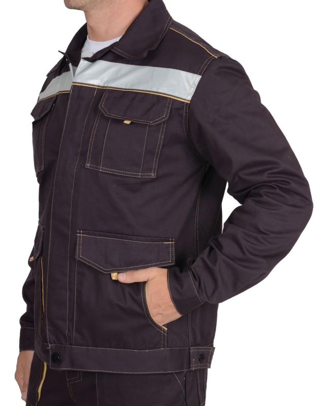 Куртка укороченная, с отложным воротником, с центральной потайной застежкой на пуговицы, пояс регулируется по ширине патами и пуговицами. Брюки с усилительными накладками в области колен. Костюм с контрастными строчками и СОП шириной 50 мм. ГОСТ 12.4.280-2014.