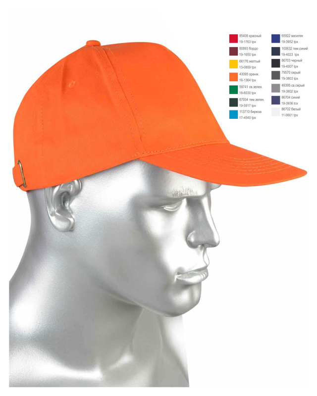 Кепи-бейсболка выполнена из текстильной ткани диагонального переплетения плотностью 200-210 гр/м2, 100% хлопок.